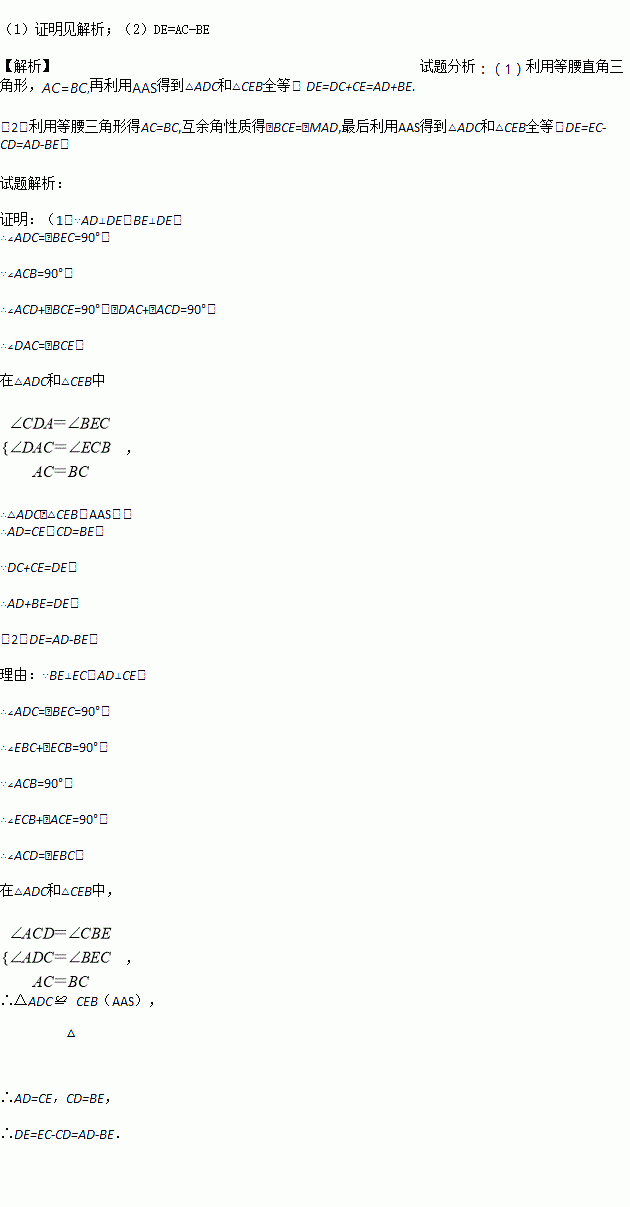 (1)当直线MN绕点C旋转到图1的位置时,求证:DE=AD+BE;