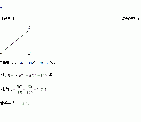 2.4. 【解析】试题解析: 如图所示:AC=130米,BC=50米, 则米, 则坡比 故答案为: