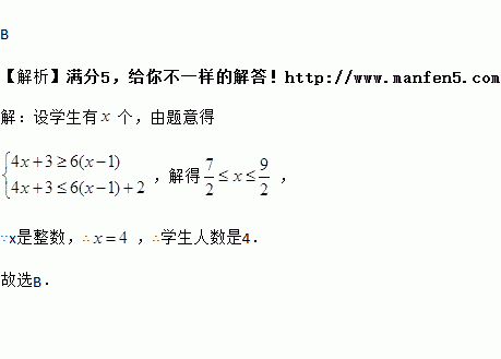 把一盒苹果分给几个学生,若每人分4个,则剩下3个,若每人分6个,则最后一个学生能得到的苹果不超过2个,则学生人数是( )