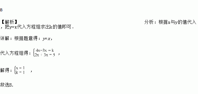 方程组的解中x与y的值相等,则k等于( )