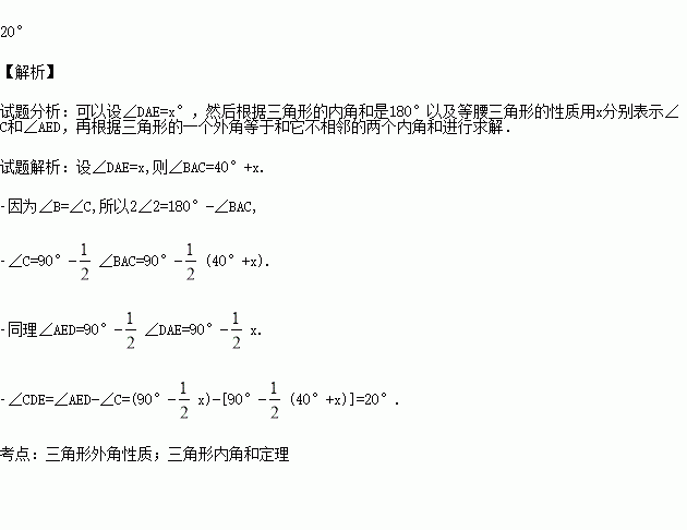 如图所示,在△ABC中,∠B=∠C,∠BAD=40°,并且∠ADE=∠AED,求∠CDE的度数.
