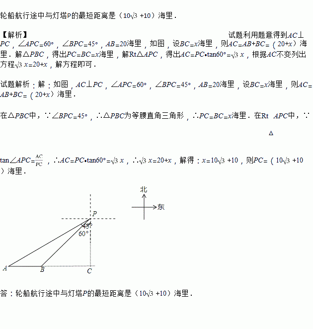 一艘轮船位于灯塔P南偏西60°方向的A处,它向东航行20海里到达灯塔P南偏西45°方向上的B处,若轮船继续沿正东方向航行,求轮船航行途中与灯塔P的最短距离.(结果保留根号)