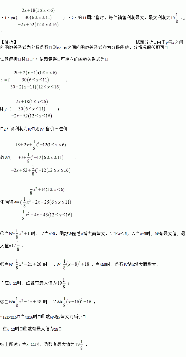 在黄州服装批发市场,某种品牌的时装当季节将来临时,价格呈上升趋势,设这种时装开始时定价为20元,并且每周(7天)涨价2元,从第6周开始保持30元的价格平稳销售;从第12周开始,当季节即将过去时,平均每周减价2元,直到第16周周末,该服装不再销售.