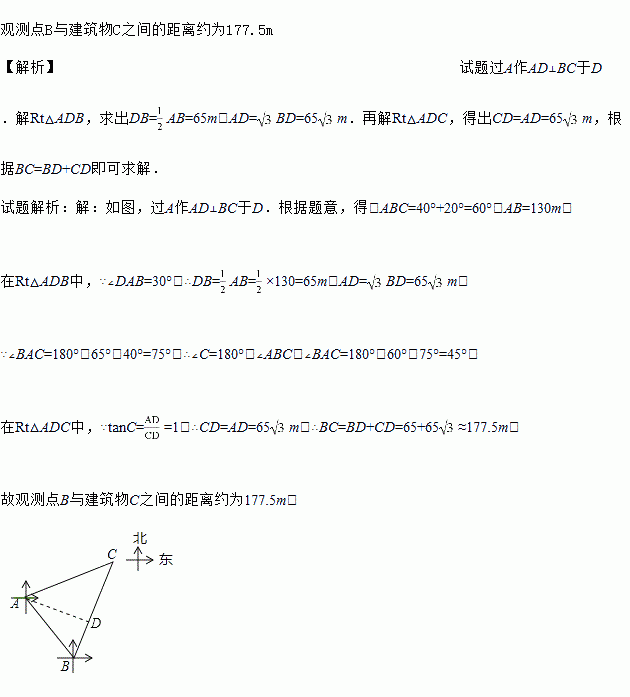 如图,建筑物C在观测点A的北偏东65°方向上,从观测点A出发向南偏东40°方向走了130m到达观测点B,此时测得建筑物C在观测点B的北偏东20°方向上,求观测点B与建筑物C之间的距离.(结果精确到0.1m.参考数据: