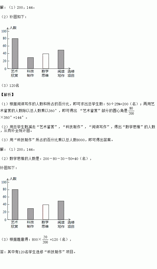 某校为了解“课程选修”的情况,对报名参加“艺术鉴赏”、“科技制作”、“数学思维”、“阅读写作”这四个选修项目的学生(每人限报一项)进行抽样调查.下面是根据收集的数据绘制的两幅不完整的统计图.