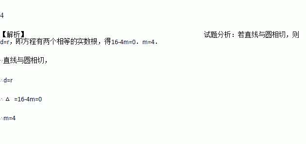 圆心O到直线l的距离为d,⊙O的半径为r,当d、r是方程x2-4x+m=0的根,且直线与⊙O相切时,m的值为__________________.