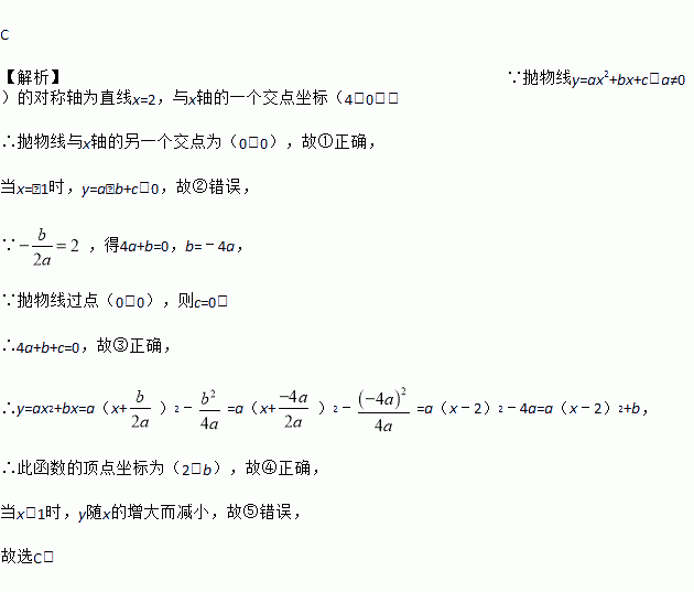 已知抛物线y=ax2+bx+c(a≠0)的对称轴为直线x=2,与x轴的一个交点坐标(4,0),其部分图象如图所示,下列结论:①抛物线过原点;②a﹣b+c<0;③4a+b+c=0;④抛物线的顶点坐标为(2,b);⑤当x<1时,y随x增大而增大.其中结论正确的是( )