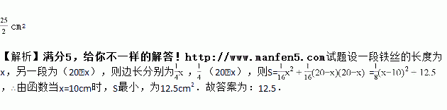 将一根长为20 cm的铁丝剪成两段,并以每一段铁丝的长度为周长各做成一个正方形,则这两个正方形面积之和的最小值是______cm2.