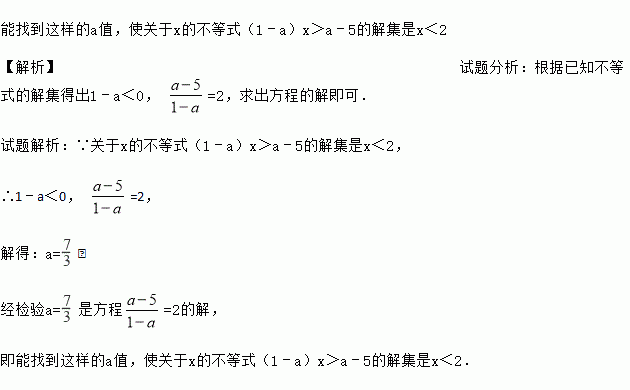 能找到这样的a值,使关于x的不等式(1﹣a)x>a﹣5的解集是x<2 【解析】试题分析:根据已知不等式的解集得出1﹣a<0, =2,求出方程的解即可. 试题解析:∵关于x的不等式(1﹣a)x>a﹣5的解集是x<2, ∴1﹣a<0, =2, 解得:a=, 经检验a=是方程=2的解, 即能找到这样的a值,使关于x的不等式(1﹣a)x>a﹣5的解集是x<2.