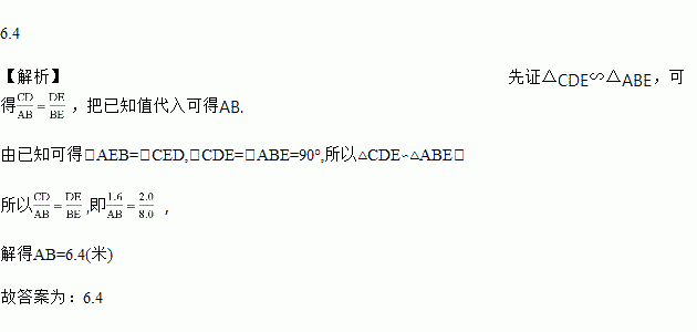 为了测量校园水平地面上一棵不可攀爬的树的高度,小文同学做了如下的探索:根据物理学中光的反射定律,利用一面镜子和一根皮尺,设计如下图所示的测量方案:把一面很小的镜子放在合适的位置,刚好能在镜子里看到树梢顶点,此时小文与平面镜的水平距离为2.0米,树的底部与平面镜的水平距离为8.0米,若小文的眼睛与地面的距离为1.6米,则树的高度约为______米(注:反射角等于入射角).