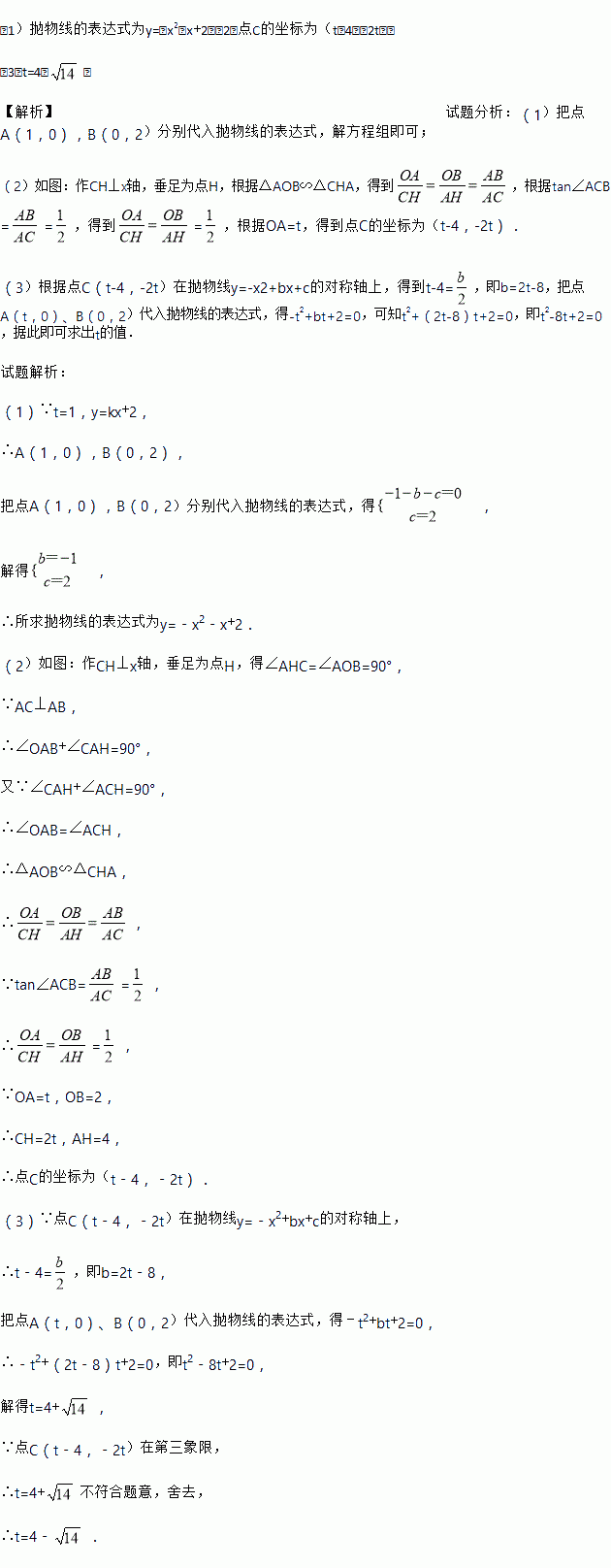 已知:如图,直线y=kx+2与x轴正半轴相交于A(t,0),与y轴相交于点B,抛物线y=﹣x2+bx+c经过点A和点B,点C在第三象象限内,且AC⊥AB,tan∠ACB=