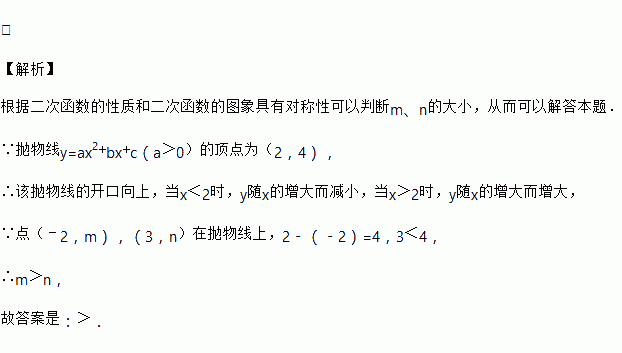 已知抛物线y=ax2+bx+c(a>0)的顶点为(2,4),若点(﹣2,m),(3,n)在抛物线上,则m_____n(填“>”、“=”或“<”).