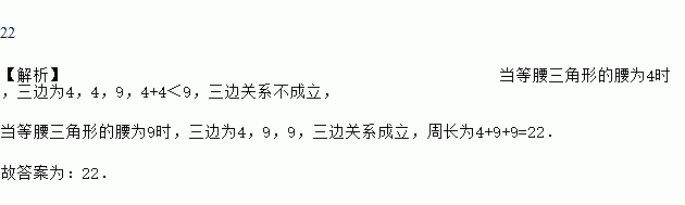 22 【解析】当等腰三角形的腰为4时,三边为4,4,9,4+4<9,三边关系不成立, 当等腰三角形的腰为9时,三边为4,9,9,三边关系成立,周长为4+9+9=22. 故答案为:22.