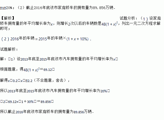 £¨1£©20%£»£¨2£©½ØÖ¹2016Äêµ×¸ÃÊмÒÍ¥½Î³µµÄÓµÓÐÁ¿Îª89.856ÍòÁ¾£® ¡¾½âÎö¡¿ÊÔÌâ·ÖÎö£º£¨1£©Éè¼ÒÍ¥½Î³µÓµÓÐÁ¿µÄÄêÆ½¾ùÔö³¤ÂÊΪx£¬ÔòÔö³¤2´ÎÒÔºóµÄ³µÁ¾ÊýÊÇ48(1£«x)2£¬ÁгöÒ»Ôª¶þ´Î·½³ÌÇó½â¼´¿É£» £¨2£©2016ÄêµÄ³µÁ¾£½2015ÄêµÄ³µÁ¾¡Á(1£«x£«10%)£® ÊÔÌâ½âÎö£º ¡¾½âÎö¡¿ £¨1£©Éè2013Äêµ×ÖÁ2015Äêµ×¸ÃÊÐÆû³µÓµÓÐÁ¿µÄÄêÆ½¾ùÔö³¤ÂÊΪx£¬ ¸ù¾Ý...