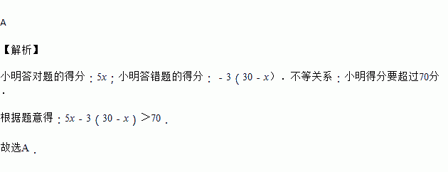 某次知识竞赛共有30道题,每一题答对得5分,答错或不答都扣3分,小亮得分要超过70分,他至少要答对多少道题?如果设小亮答对了x道题,根据题意列式得( )