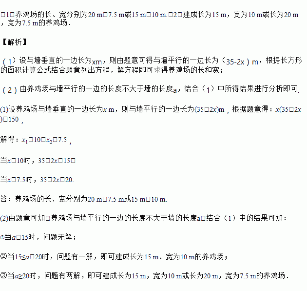 如图,要建一个面积为150 m2的矩形养鸡场,为了节约材料,养鸡场的一边沿用原来的一堵墙,墙长为a m,其余三边用竹篱笆围成,已知竹篱笆的长为35 m.