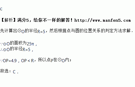 若⊙O的面积为25π,在同一平面内有一个点P,且点P到圆心O的距离为4.9,则点P与⊙O的位置关系为( )