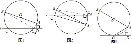 (3)若将直线l平移到与⊙O相切时,切点为C,其他条件不变,请你在图3上画出变化后的图形,标好相应的字母并猜想AC、AB、AD的关系是什么?(只写出关系,不加以说明)