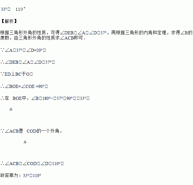 如图,△ABC中,D是AC延长线上一点,E是AB上一点,ED⊥BC于O,∠A=37°,∠D=20°,则∠B=________°,∠ACB=________°.