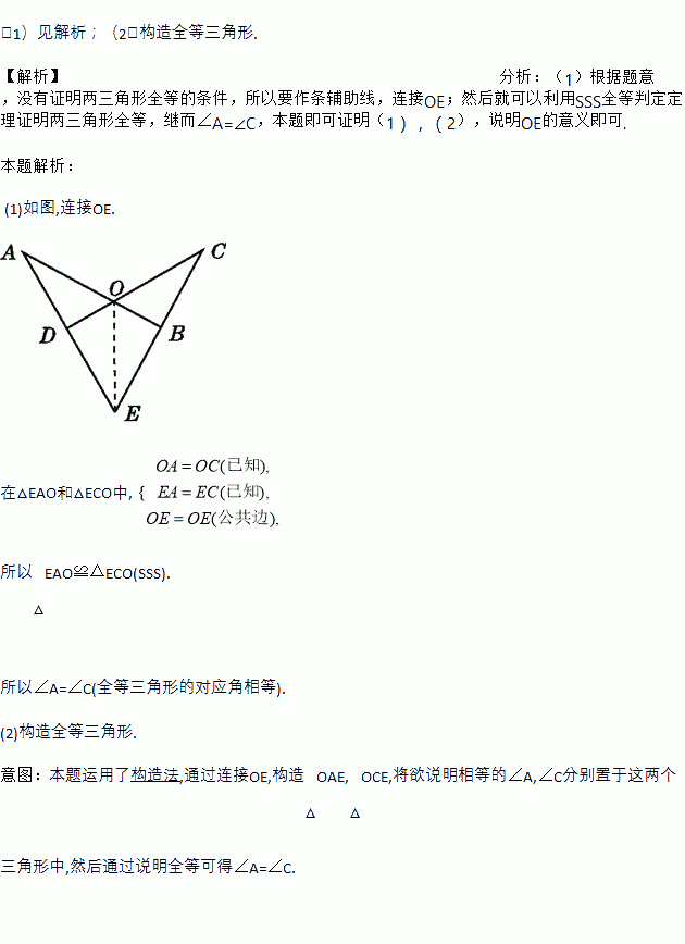 £¨1£©¼û½âÎö£»£¨2£©¹¹ÔìÈ«µÈÈý½ÇÐÎ. ¡¾½âÎö¡¿·ÖÎö£º£¨1£©¸ù¾ÝÌâÒ⣬ûÓÐÖ¤Ã÷Á½Èý½ÇÐÎÈ«µÈµÄÌõ¼þ£¬ËùÒÔÒª×÷Ìõ¸¨ÖúÏߣ¬Á¬½ÓOE£»È»ºó¾Í¿ÉÒÔÀûÓÃSSSÈ«µÈÅж¨¶¨ÀíÖ¤Ã÷Á½Èý½ÇÐÎÈ«µÈ£¬¼Ì¶ø¡ÏA=¡ÏC£¬±¾Ìâ¼´¿ÉÖ¤Ã÷£¨1£©£¬£¨2£©£¬ËµÃ÷OEµÄÒâÒå¼´¿É. ±¾Ìâ½âÎö£º (1)Èçͼ,Á¬½ÓOE. ÔÚ¡÷EAOºÍ¡÷ECOÖÐ, ËùÒÔ¡÷EAO¡Õ¡÷ECO(SSS). ËùÒÔ¡ÏA=¡ÏC(È«µÈÈý½ÇÐÎ...