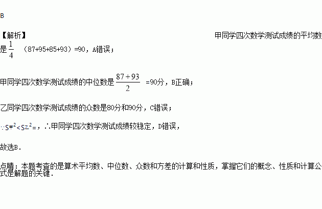 甲、乙两名同学某学期的四次数学测试成绩(单位:分)如下表: