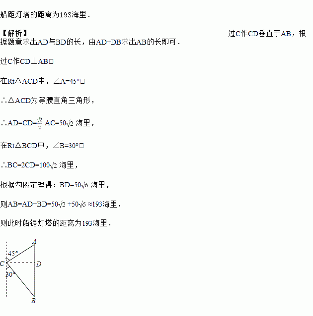 如图,一艘海轮位于灯塔C的北偏东45方向,距离灯塔100海里的A处,它沿正南方向航行一段时间后,到达位于灯塔C的南偏东30°方向上的B处,求此时船距灯塔的距离(参考数据:
