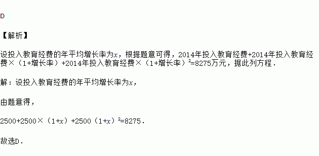 为执行“两免一补”政策,某地区2014年投入教育经费2500万元,预计到2016年,三年共投入8275万元.设投入教育经费的年平均增长率为x,那么下列方程正确的是( )