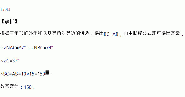 如图,一条船从A处出发,以15里/小时的速度向正北方向航行,10个小时到达B处,从A、B望灯塔,得∠NAC=37°,∠NBC=74°,则B到灯塔C的距离是_____里.