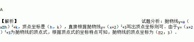 A 【解析】试题分析:抛物线y=a(x﹣h)2+k,顶点坐标是(h,k),直接根据抛物线y=(x+2)2+3写出顶点坐标则可.由于y=(x+2)2+3为抛物线的顶点式,根据顶点式的坐标特点可知,抛物线的顶点坐标为(﹣2,3).