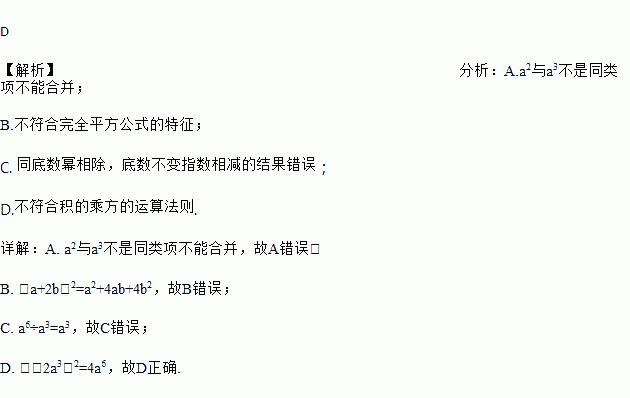 A. a2+a3=a5 B. (a+2b)2=a2+2ab+b2 C. a6÷a3=a2 D. (﹣2a3)2=4a6