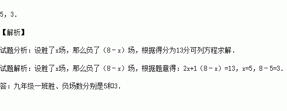 (7分)为有效开展阳光体育活动,云洱中学利用课外活动时间进行班级篮球比赛,每场比赛都要决出胜负,每队胜一场得2分,负一场得1分.已知九年级一班在8场比赛中得到13分,问九年级一班胜、负场数分别是多少?