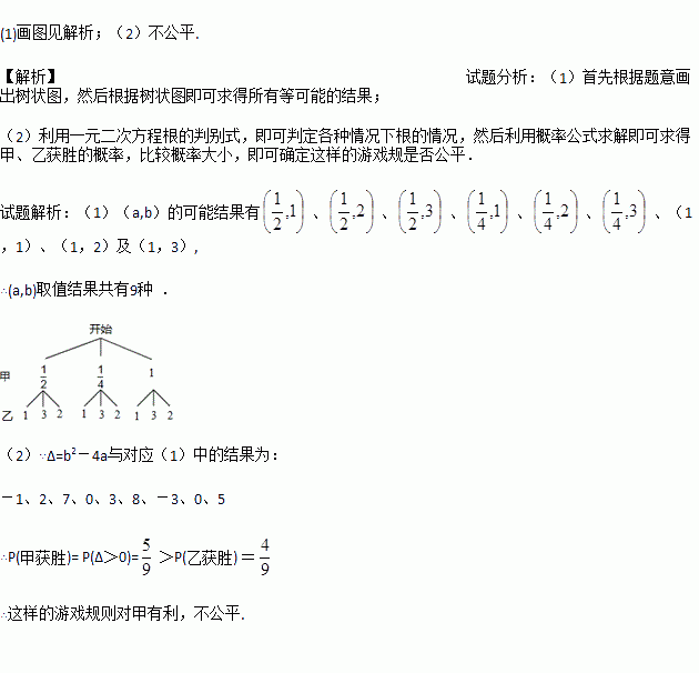 (2)现制定一个游戏规则:若所选出的a,b能使得ax2+bx+1=0有两个不相等的实数根,则甲获胜;否则乙获胜.请问这样的游戏规则公平吗?请用概率知识解释.