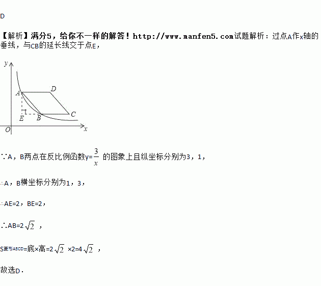 (2015重庆市)如图,在平面直角坐标系中,菱形ABCD在第一象限内,边BC与x轴平行,A,B两点的纵坐标分别为3,1.反比例函数