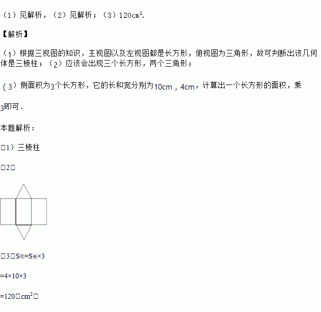 (3)若主视图的长为10cm,俯视图中三角形的边长为4cm,求这个几何体的侧面积.