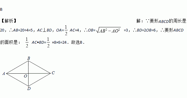 B 【解析】【解析】 ∵菱形ABCD的周长是20,∴AB=20÷4=5,AC⊥BD,OA=AC=4,∴OB= =3,∴BD=2OB=6,∴菱形ABCD的面积是: AC•BD=×8×6=24.故选B.