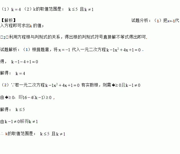 (1)(2)k的取值范围是: 且 【解析】试题分析:(1)把x=-1代入方程即可求出k 的值; (2)利用方程根与判别式的关系,得出根的判别式符号直接解不等式得出即可. 试题解析:(1)根据题意,将代入一元二次方程. 得, 解得: (2)∵若一元二次方程有实数根,则需 由, 解得: 由 k的取值范围是: 且
