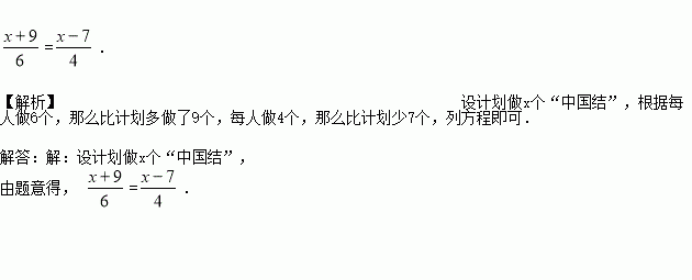 某小组计划做一批中国结,如果每人做6个,那么比计划多做了9个;如果每人做4个,那么比计划少7个.设计划做x个中国结,可列方程______________________.