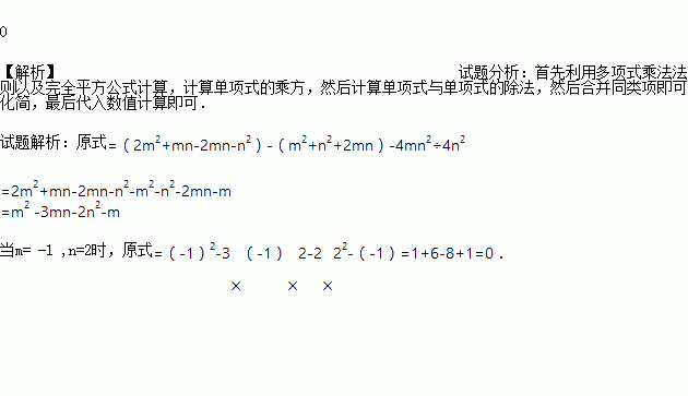 先化简再求值:求(2m+n)(m-n)—(m+n)2—4mn2÷(-2n)2的值,其中m= -1 ,n=2