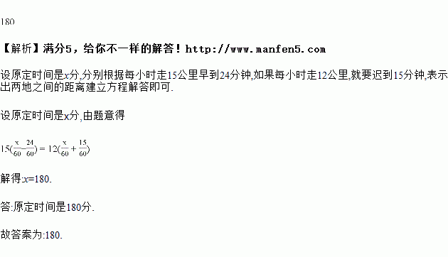一个通讯员骑自行车需要在规定时间内把信件送到某地,每小时走15公里早到24分钟,如果每小时走12公里,就要迟到15分钟,原定时间是________分.