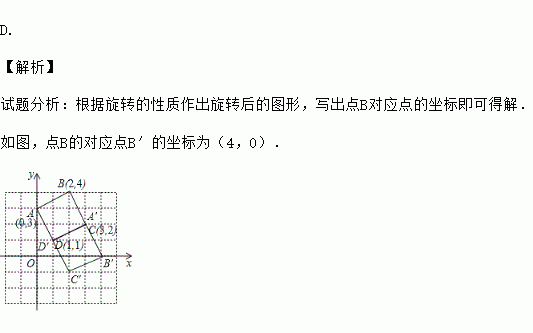D. 【解析】 试题分析:根据旋转的性质作出旋转后的图形,写出点B对应点的坐标即可得解. 如图,点B的对应点B′的坐标为(4,0).