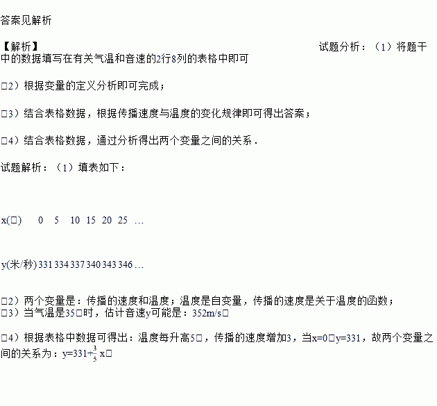 答案见解析 【解析】试题分析:(1)将题干中的数据填写在有关气温和音速的2行8列的表格中即可 (2)根据变量的定义分析即可完成; (3)结合表格数据,根据传播速度与温度的变化规律即可得出答案; (4)结合表格数据,通过分析得出两个变量之间的关系. 试题解析:(1)填表如下: x(℃) 0 5 10 15 20 25 … ...