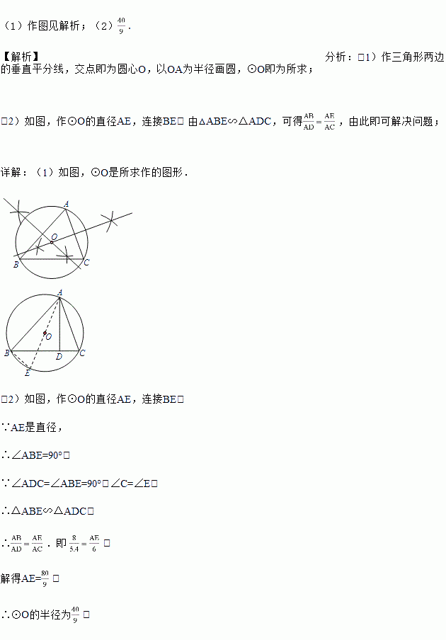 (2)若AB=8,AC=6,AD=5.4,求⊙O的半径.