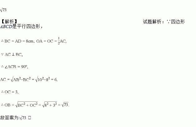 如图,在□ABCD中,AC,BD相交于点O,AB=10cm,AD=8cm,AC⊥BC,则OB= _________cm.