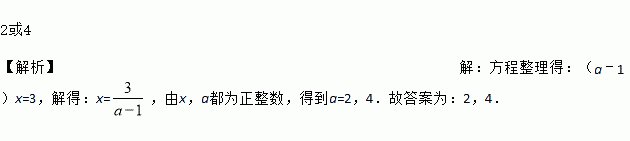 2或4 【解析】【解析】 方程整理得:(a﹣1)x=3,解得:x=,由x,a都为正整数,得到a=2,4.故答案为:2,4.