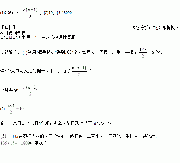 (1)①6;② ;(2)10;(3)18090 【解析】试题分析:(1)根据阅读材料得到规律; (2)、(3)利用(1)中的规律进行答题; 试题解析: (1)利用“握手解法”得到: ①4个人每两人之间握一次手,共握了次; ②n个人每两人之间握一次手,共握了次. 故答案为:6, . (2) 答:一条直线上共有5个点,那么这条直线上共有10条线段; 有135...