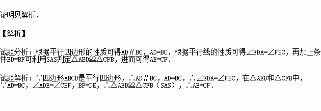 如图所示,点E,F是平行四边形ABCD对角线BD上的点,BF=DE,求证:AE=CF.