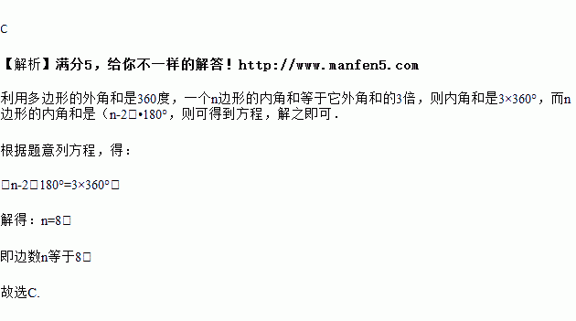如果n边形的内角和是它外角和的3倍,则n等于()