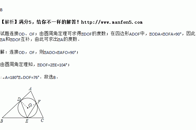 如图,△ABC的内切圆⊙O与AB,BC,CA分别相切于点D,E,F,若∠DEF=52°,则∠A的度数是( )