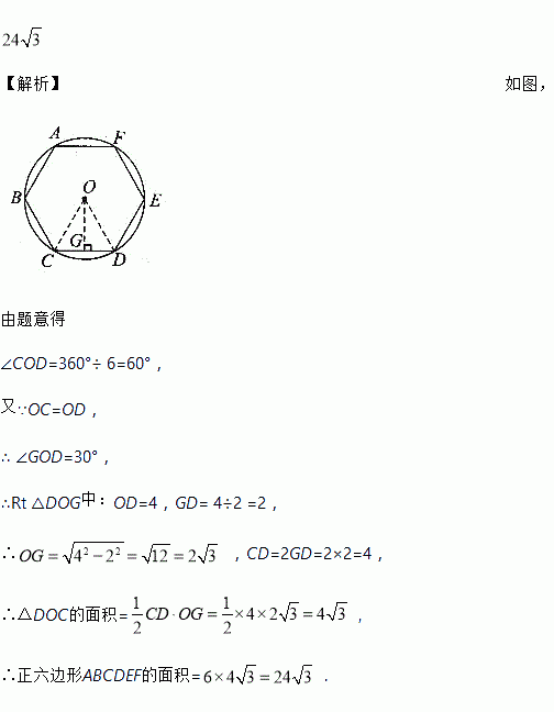 【解析】如图, 由题意得 ∠COD=360°÷ 6=60°, 又∵OC=OD, ∴ ∠GOD=30°, ∴Rt △DOG中:OD=4,GD= 4÷2 =2, ∴ ,CD=2GD=2×2=4, ∴△DOC的面积= , ∴正六边形ABCDEF的面积= .