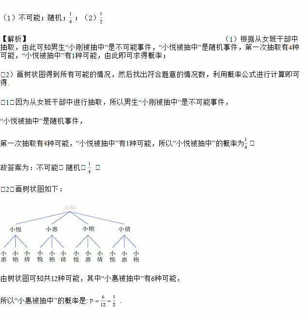 今年某市为创评“全国文明城市”称号,周末团市委组织志愿者进行宣传活动.班主任梁老师决定从4名女班干部(小悦、小惠、小艳和小倩)中通过抽签的方式确定2名女生去参加.